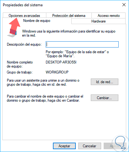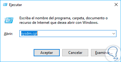 Para solucionar esto usaremos la combinación de teclas siguiente y en la ventana desplegada ejecutamos el comando “sysdm.cpl”:
