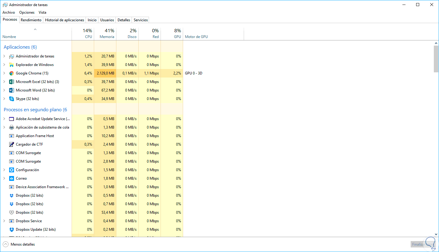 Es importante que sepamos identificar que programa o aplicación está haciendo un alto consumo de dicho recurso y para ello podemos ir al administrador de tareas y allí validar en la pestaña Procesos los programas abiertos actualmente y verificar el uso de RAM: