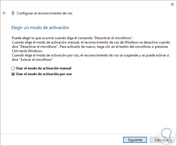 Posteriormente seleccionamos el modo de activación del reconocimiento de voz, tendremos las siguientes opciones: