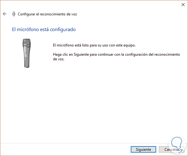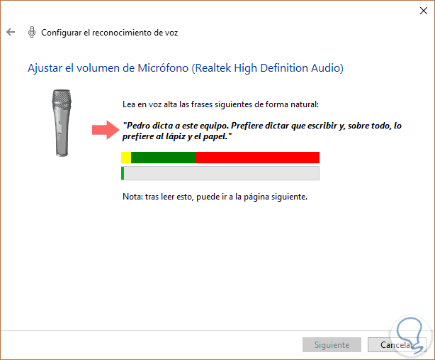 Una vez leamos el texto, se activará la casilla Siguiente y en la próxima ventana veremos que el micrófono está listo y configurado: