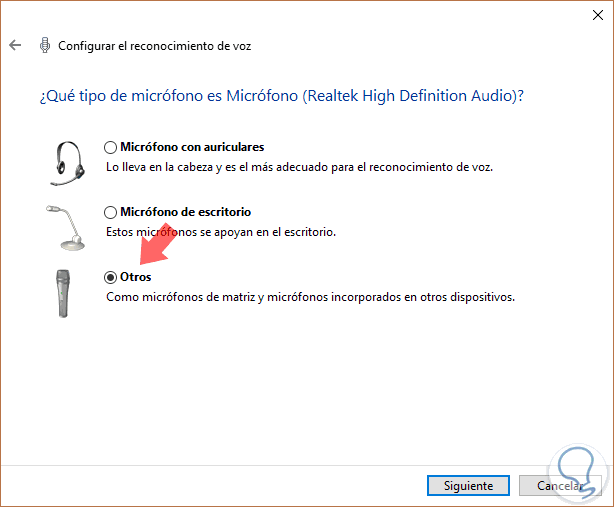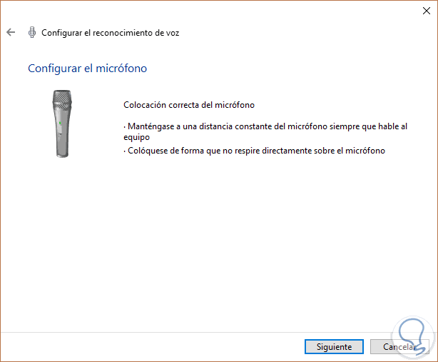 De nuevo pulsamos en Siguiente y será desplegada la siguiente ventana donde se indica la forma ideal de ubicar el micrófono para la configuración: