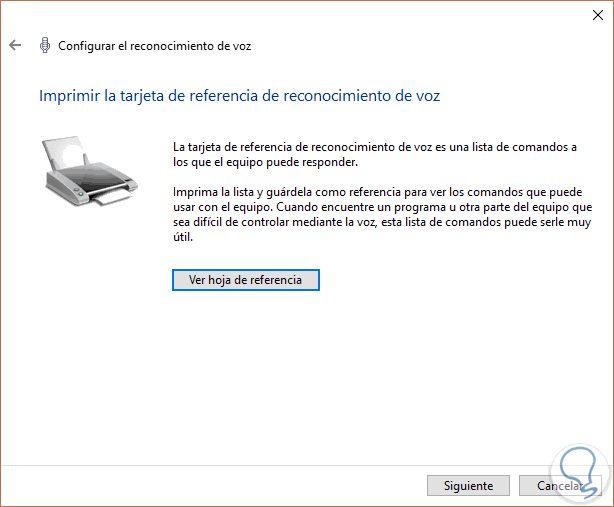 Una vez definido el método deseado pulsamos en Siguiente y podremos, si así lo deseamos, imprimir una lista con los comandos de voz disponibles en Windows 10: