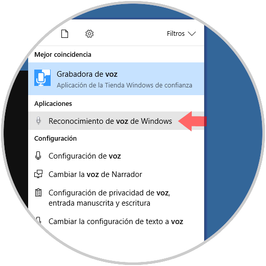 Para esto, ingresaremos la palabra voz en el cuadro de búsqueda de Windows 10 y allí seleccionamos la opción Reconocimiento de voz de Windows: