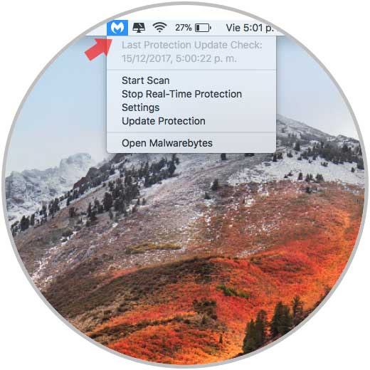 Tan pronto se instale Malwarebytes en macOS High Sierra, se creará un acceso directo en la barra de titulo y al pulsarlo veremos lo siguiente: