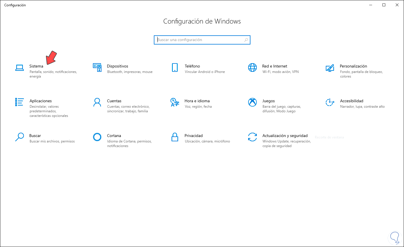 Para este proceso debemos ir al menú Inicio y allí seleccionar la utilidad “Configuración”. Allí vamos a la categoría “Sistema”.