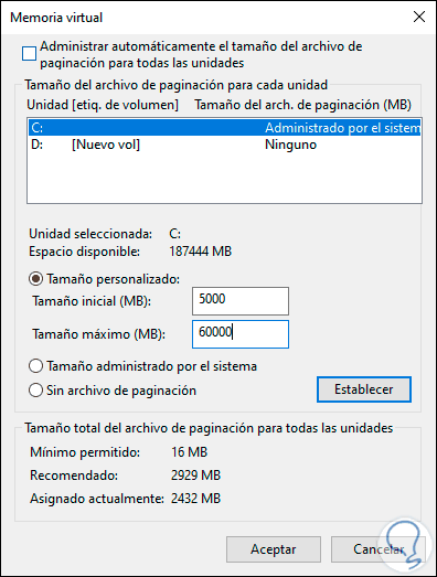 - El tamaño máximo del archivo de paginación es igual a tres veces (3) X Tamaño inicial.