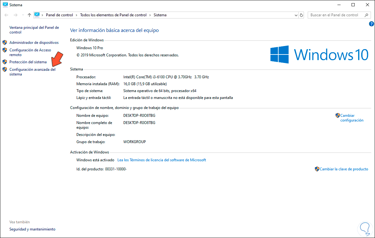 Damos clic en la línea “Configuración avanzada del sistema” ubicada en el costado lateral izquierda y se desplegará lo siguiente: