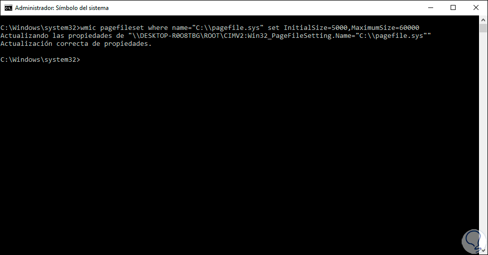 Ahora con el siguiente comando vamos a gestionar la memoria virtual de forma personalizada en Windows 10:
