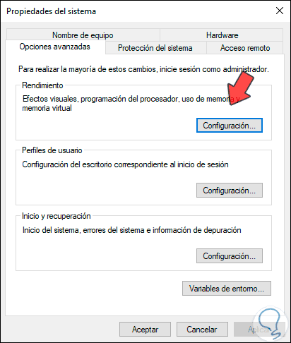 Allí damos clic en el botón “Configuración” ubicado en el campo “Rendimiento” y en la próxima ventana iremos a la pestaña “Opciones avanzadas” donde veremos lo siguiente:
