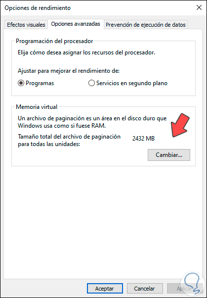 Vamos a la sección “Memoria virtual” y allí podemos validar cuál es el tamaño del archivo de paginación actúa. Para editar este valor damos clic en Cambiar y en la siguiente ventana haremos lo siguiente. Pulsamos en el botón Aceptar para guardar los cambios y luego damos clic en Aplicar y Aceptar para salir del asistente.