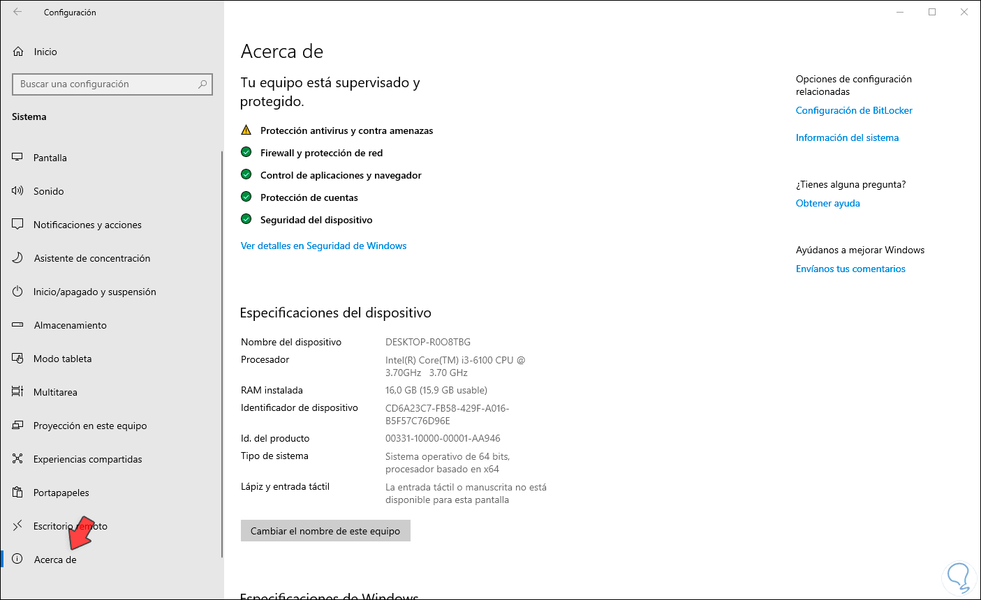 En la siguiente ventana vamos a la sección “Acerca de”: