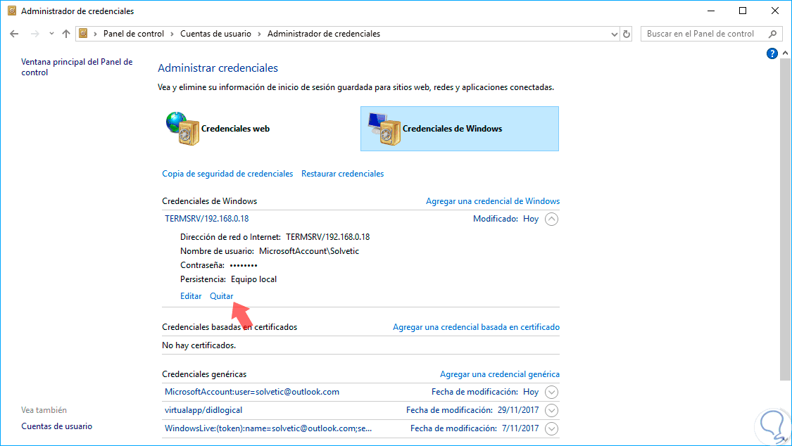 Aquí veremos los diferentes credenciales guardados en nuestro equipo. Para eliminar nuestro credencial del Escritorio Remoto lo buscamos en la lista y pulsamos en "Quitar" para que se elimine.