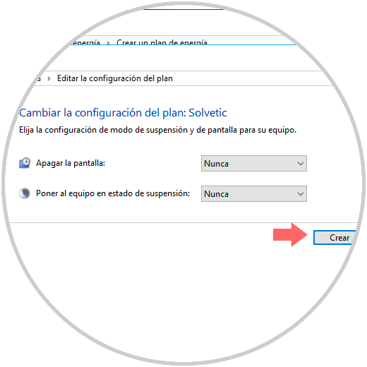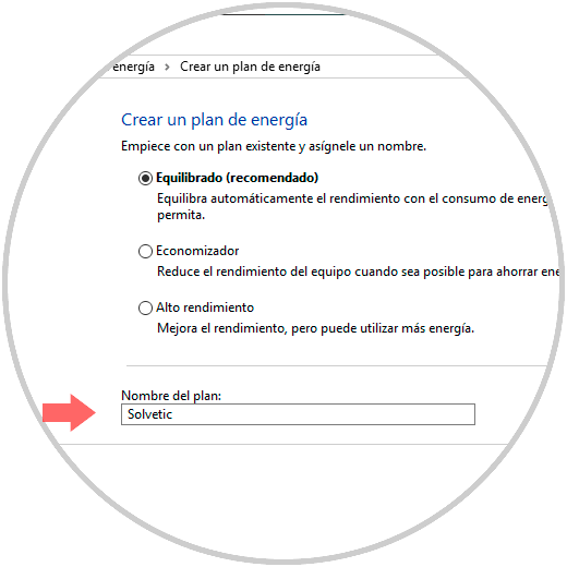 Allí damos clic sobre la línea “Crear un plan de energía” ubicada en el costado izquierdo y en la nueva ventana podremos seleccionar alguna de las opciones de plan disponibles así como definir un nombre para tal plan: