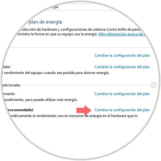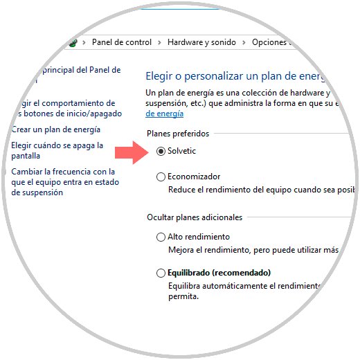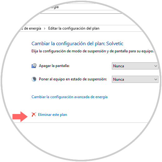 Luego, daremos clic en la línea “Cambiar la configuración del plan” ubicada al lado del plan a eliminar, en este caso el plan de energía Solvetic y se desplegara la siguiente ventana: