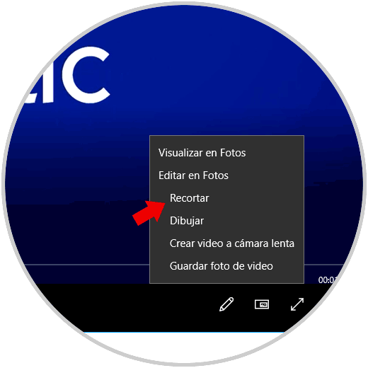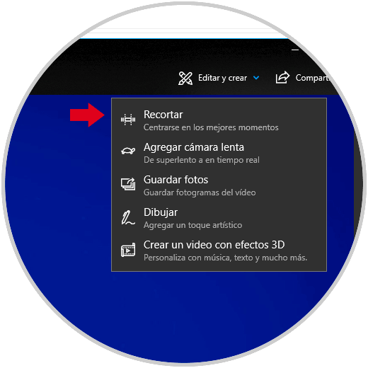 Durante la reproducción del vídeo, damos clic en la parte superior de este y se activará el menú “Editar y crear” y allí seleccionaremos la opción “Recortar”: