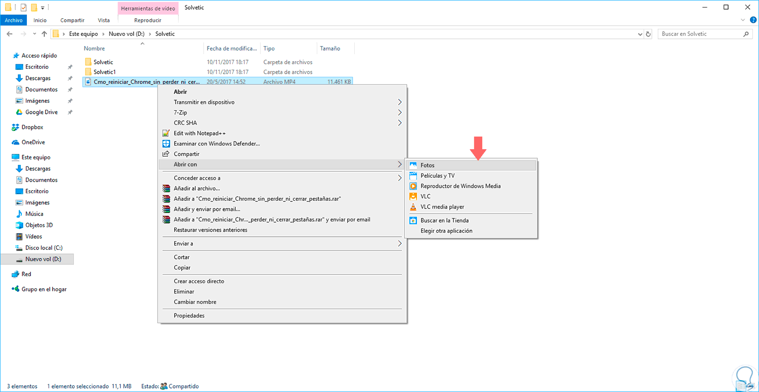 Para esto, vamos a la ubicación del vídeo y allí daremos clic derecho sobre él y seleccionamos la opción “Abrir con / Fotos”: