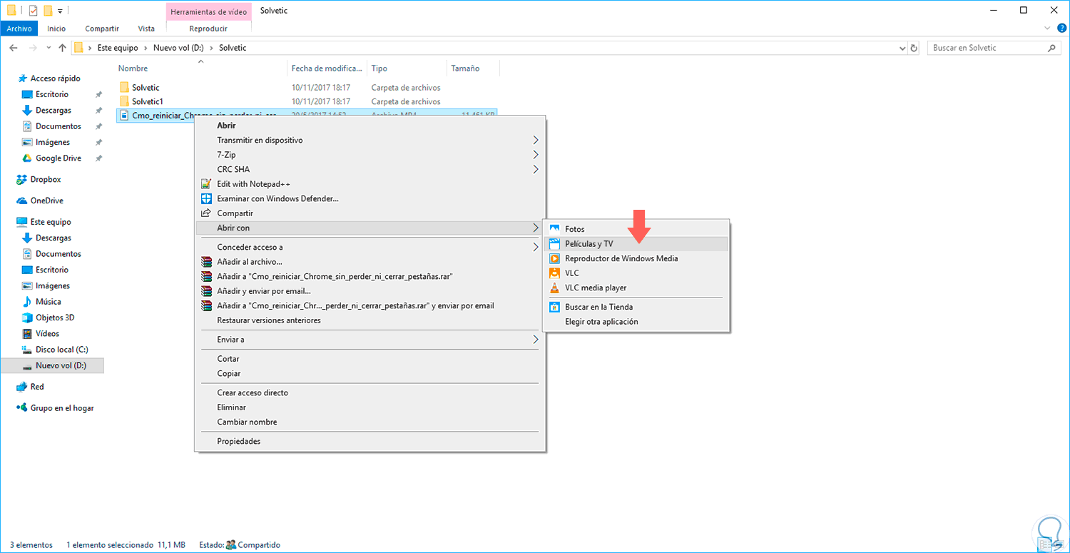 Otra de las opciones que nos ofrece Windows 10 es Películas y TV, para acceder a esta opción, daremos de nuevo clic derecho sobre el vídeo y seleccionamos “Abrir con / Películas y TV”: