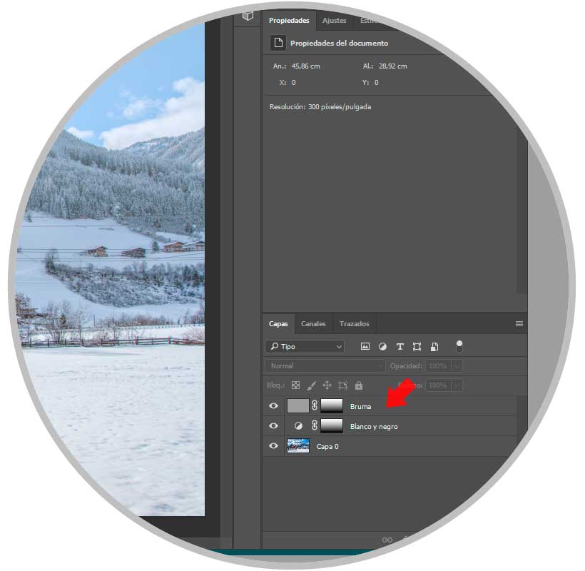 Selecciona la máscara de capa en le capa “Blanco y negro” y mientras mantienes pulsada la tecla Alt arrastra y suelta sobre la capa de Bruma. Con esto haremos que el degradado afecte a ambas capas.