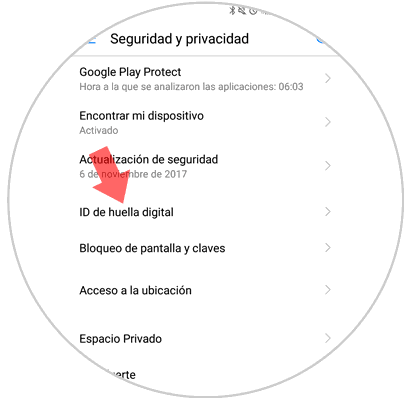 Una vez dentro del menú de “Seguridad y Privacidad” de tu Huawei Mate 10 deberás pulsar la opción llamada “ID de huella digital”. Pulsa aquí.
