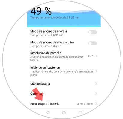 En esta pantalla aparecerán varios aspectos referentes a la batería que dispone en ese momento tu teléfono, apareciendo en la parte superior de la pantalla en tamaño grande el porcentaje. En la parte inferior hay una opción llamada “Porcentaje de batería” que hace referencia sobre donde quieres que aparezca el porcentaje de batería en la pantalla principal del teléfono. Pulsa aquí.