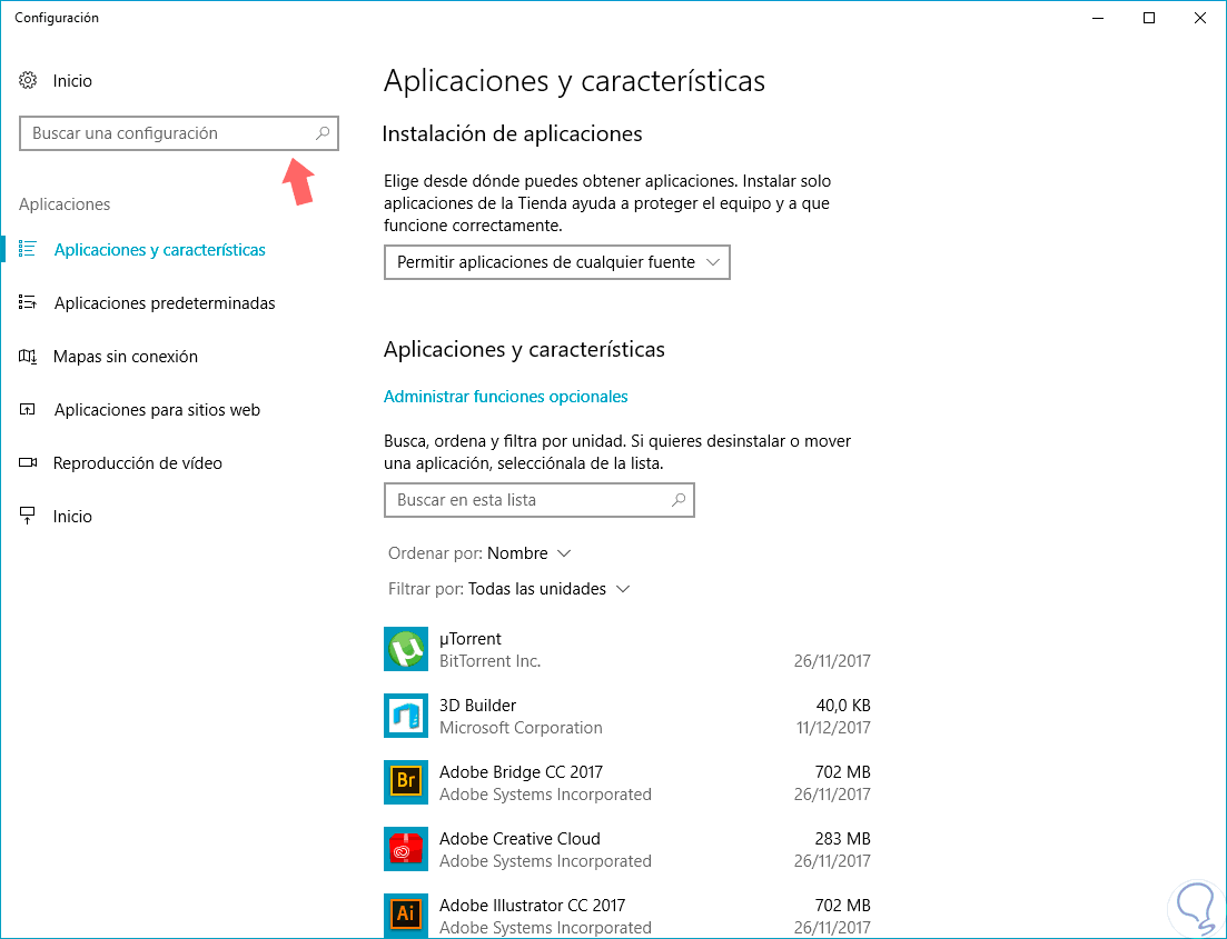 Si de estas formas no consigues encontrar la aplicación correspondiente prueba a acceder a la ruta “Configuración” y buscarlo en el cuadro de búsqueda de “Aplicaciones y características”.