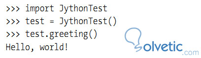 Podemos ver en el ejemplo que no es más que una simple clase con un método void que nos retorna una impresión de un mensaje, en este caso el icónico Hello, world!, ahora en la siguiente imagen veremos cómo podemos hacer el llamado a este código desde nuestra consola de Python con Jython: