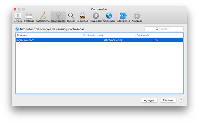 Si deseamos eliminar alguna entrada pulsamos en el botón Administrar contraseñas y luego basta con pasar el puntero sobre el sitio deseado y pulsar en el signo X desplegado al lado derecho de este: