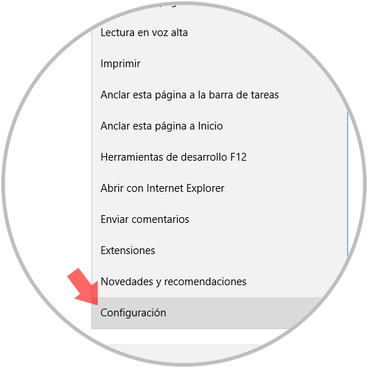 Edge es la apuesta de Microsoft para llamar la atención de sus millones de usuarios al establecerlo como el navegador por defecto en Windows 10. Para realizar este proceso en Microsoft Edge debemos dar clic en el icono de menú del navegador y seleccionar la opción Configuración:
