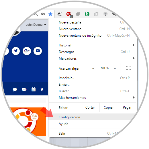 Google Chrome es uno de los navegadores actuales mas usados a nivel mundial y es un blanco perfecto de este tipo de amenazas. Para deshabilitar esta función en Google Chrome pulsamos en el botón Personaliza y controla Google Chrome (icono con tres puntos horizontales) y de las opciones desplegadas seleccionamos Configuración: