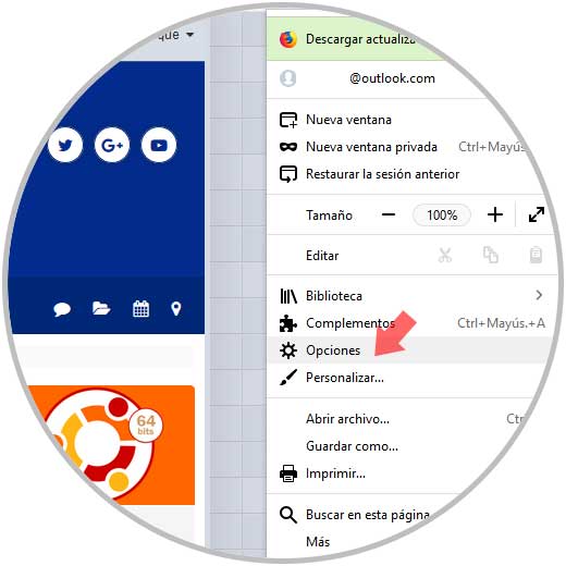 Para borrar una contraseña ya almacenada, o todas si así lo deseamos, debemos pulsar en el botón de menú de Firefox y seleccionar la línea Opciones: