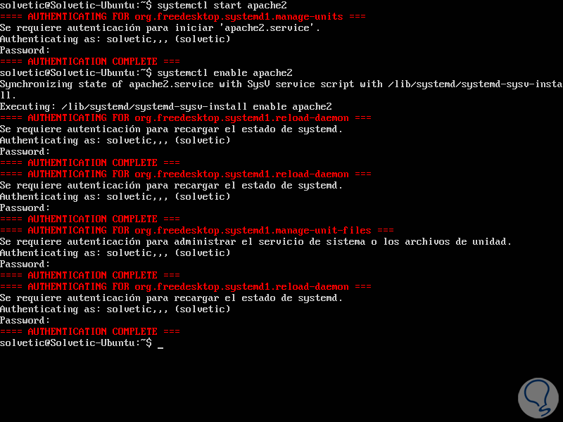 systemctl start apache2 (Inicia el servicio Apache)systemctl enable apache2 (Habilita Apache para que sea ejecutado en el inicio de Ubuntu)