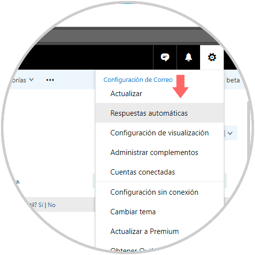 Una vez iniciemos sesión, pulsamos en el icono de engranaje ubicado al lado de nuestra cuenta y en las opciones desplegadas seleccionamos “Respuestas automáticas”: