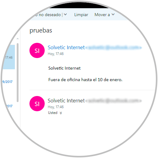 Ahora cuando recibamos un nuevo correo el remitente recibirá la respuesta automática según haya sido configurada: