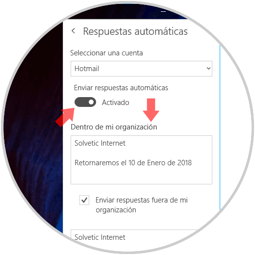 - Dentro de mi organización: Esta sección envía solo la respuesta automática los usuarios dentro del dominio.