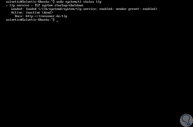 Podremos validar el estado actual del servicio TLP ejecutando la siguiente línea: