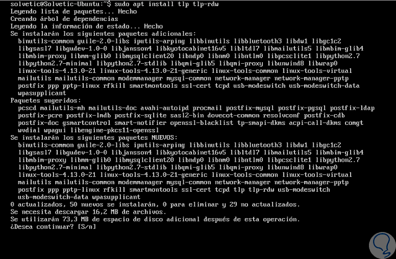 Ingresamos la letra S para confirmar la descarga e instalación de los paquetes de TLP. Los paquetes que son instalados son los siguientes: