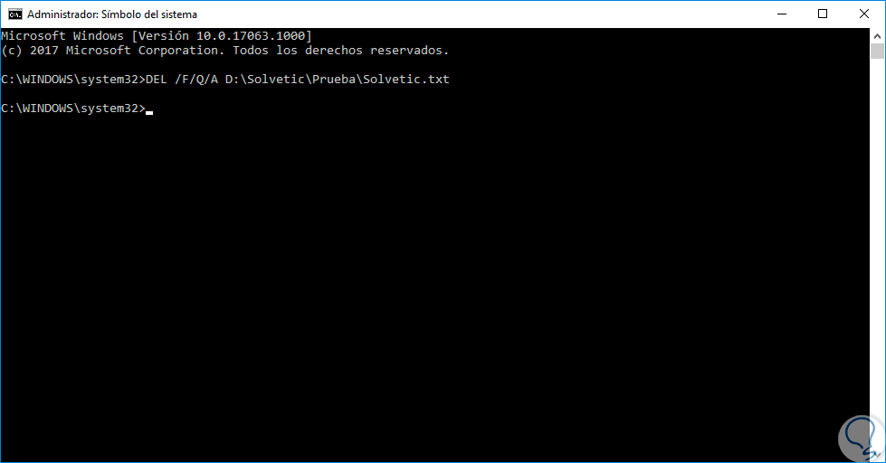 Para borrar un archivo en Windows 10 debemos acceder al símbolo del sistema como administradores y, una vez allí, podemos ejecutar la siguiente sintaxis: