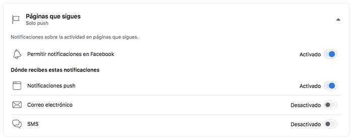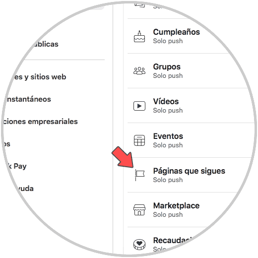Verás todas las opciones de notificaciones que tienes en Facebook. Entra en el apartado de "Páginas que sigues"