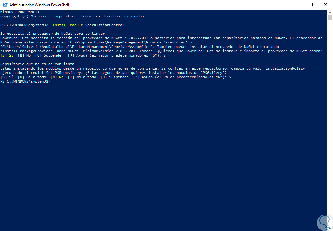 En las preguntas desplegadas ingresaremos la letra S para confirmar: