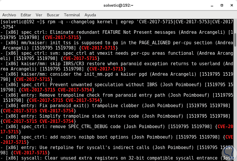 rpm -q --changelog kernel | egrep 'CVE-2017-5715|CVE-2017-5753|CVE-2017-5754'