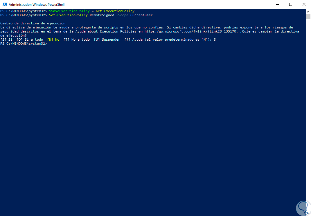 La política de ejecución estándar de Windows no nos va a permitir ejecutar este script, para ello, con el fin de ejecutar el script, debemos guardar la configuración actual para que pueda ser restaurada más adelante y luego cambiar la política de ejecución para que se pueda ejecutar el script. Para esto ejecutaremos los siguientes dos comandos: