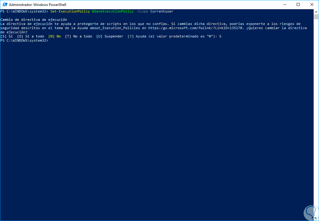 Para restablecer la política de ejecución a su configuración original después de haber comprobado la seguridad del sistema, podemos ejecutar la siguiente línea: