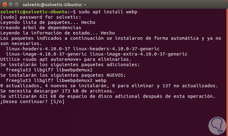 Ingresamos la letra S para confirmar la descarga e instalación de la aplicación. En el caso de otras distribuciones de Linux, es posible descargar el paquete webp del repositorio oficial de Google Analytics haciendo uso del comando wget así:
