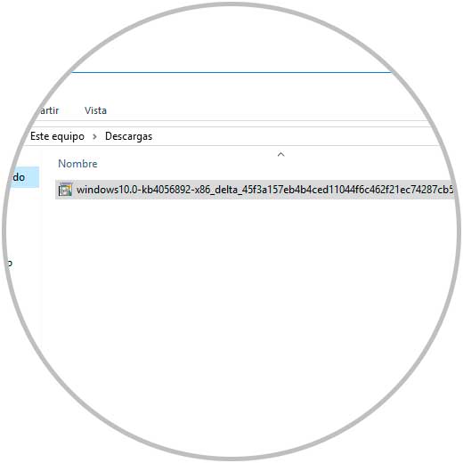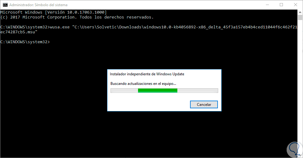 wusa.exe “C:\Users\Solvetic\Downloads\windows10.0-kb4056892-x86_delta_45f3a157eb4b4ced11044f6c462f21ec74287cb5.msu”