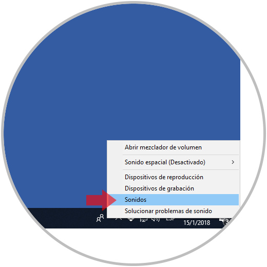 Para este proceso desde la barra de tareas en Windows 10 basta con dar clic derecho sobre el icono de sonido y en la lista desplegada seleccionar la opción Sonido.