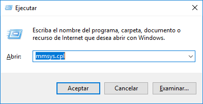 Para llevar a cabo este proceso, usaremos la combinación de teclas + R y ejecutaremos el comando mmsys.cpl: