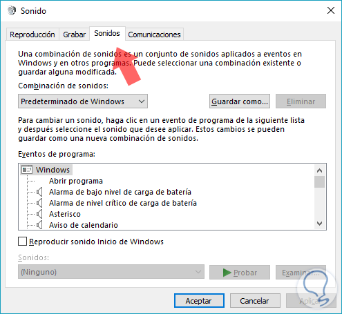 Esto desplegará la ventana Sonidos descrita anteriormente.