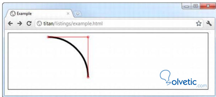 Finalmente la curva es dibujada como la línea más corta entre el último sub-path y el segundo punto que describe una curva de un circulo con el radio especificado por el último argumento, para que veamos a que nos referimos, el código incorpora unas líneas de referencia en color rojo. Veamos a continuación una imagen de cómo queda esto en nuestro navegador: