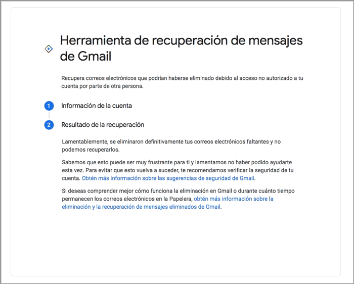 En el caso de que sea posible recuperar tus mensajes, el proceso continuará. Si no es posible su recuperación, aparecerá el siguiente mensaje.