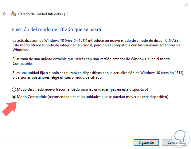 Seleccionamos la opción mas adecuada y pulsamos en Siguiente, y ahora será necesario definir el tipo de cifrado. Es recomendable usar la opción Modo Compatible ya que la tarjeta SD puede ser usada en otros dispositivos.